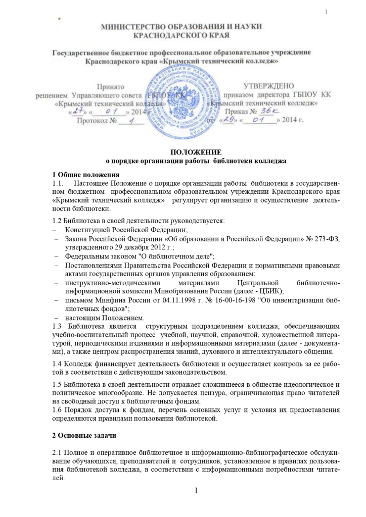 Положение о порядке организации работы библиотеки колледжа от 29.01.2014