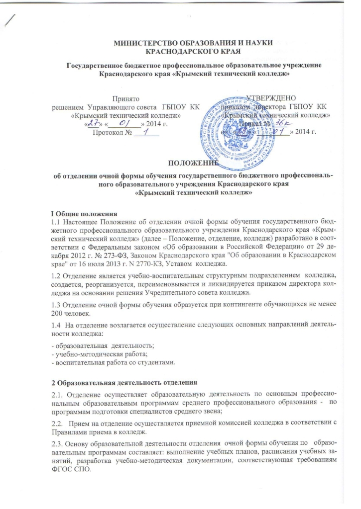 Положение об отделении очной формы обучения государственного бюджетного профессионального образовательного учреждения Краснодарского края "Крымский технический колледж" от 29.01.2014